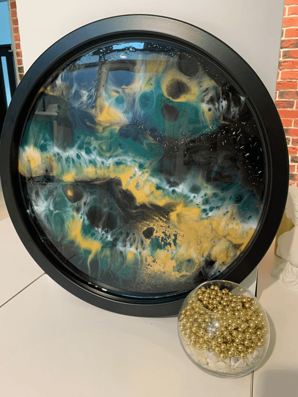 • Все материалы, а именно: эпоксидная смола, красители, добавки и сам столик-поднос черного или белого цвета диаметром 47 см в общем и 42 см - именно картины, вы можете выбрать технику рисования: Море, Космос, абстракция, ваш собственный дизайн по примеру и др.